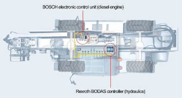 Rexroth has teamed with Bosch to develop a new control strategy which it said retains the accustomed lively response of the travel drive and implement hydraulics even under conditions of diminished load response and lower engine speeds. DHC changes the traditional function sequence and lets the diesel engine know of expected load requirements. This is accomplished using matched controllers from Bosch for engine management and from Rexroth for the travel drive and implement hydraulics.