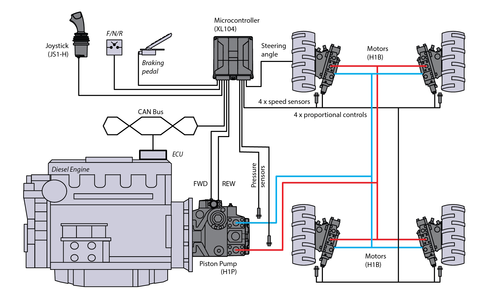 PC-AC MultiMotor operates with the Danfoss XL104 microcontroller, a PLd/SIL 2 certifiable controller that meets current functional safety standards. The software supports multiple steering configurations, including Ackermann single- or dual-axle and articulated steering. It is designed to improve steering precision and compatibility across different machine types. Typical four-motor system applications include sprayers, grape harvesters, self-propelled agricultural equipment and wheel-assist systems. Two-motor configurations are commonly used in feeder mixers, forage harvesters, graders and mining equipment.